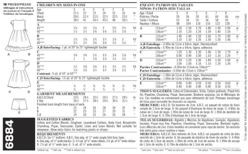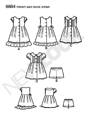 -. Feature : Child Dresses in size A (3-4-5-6-7-8), New Look Pattern #6884 / Number of looks included: 5 / Designed in UK, Manufactured in USA / Instructions are written in English, Spanish, and French / Sested fabrics: Cotton and Cotton Blends, Gingham, Laundered Cottons, Baby Cord, Broadcloth, Chambray, Pique, Seersucker, Eyelet, Linen and Linen Blends; not suitable for sleepwear; allow extra fabric for matching plaids or stripes