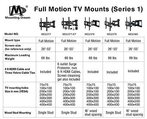 -. Title : Mounting Dream MD2378 TV Wall Mount Bracket with Full Motion Articulating Arm (15" Extension) for most of 26-55 Inches LED, LCD and Plasma TVs up to VESA 400x400mm and 66lbs, with Tilt, Swivel, and Rotation Adjustment, Including 6 ft HDMI Cable and Magnetic Bubble Level (For 26, 28, 32, 40, 42, 47, 48, 49, 50, 51, 55 Inch TV)
