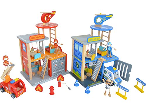 -. Feature : All-in-1 Police and Fire station play set, now bundled together for an awesome pretend play experience! / Interactive Features - Garage door opens and closes, firemen can slide down the pole, and use the ladder to climb the roof, and an expandable hose for real time role-play! / Attention To Detail - All the accessories, the overall design and both stations' play dynamics are carefully crafted for a complete every day heroes playing experience / Easy & Quick Assembly - Your kids will be playing in no time! Each Set Measures 17.7" x 17.1" x 11" inches / Quality Wood - Made with premium craftsmanship, child-friendly and durable wood