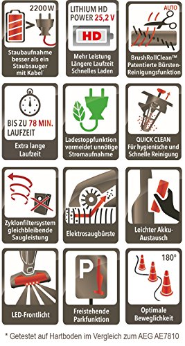 Keiner saugt langer, dank der Lithium HD Power Technologie mit starken 25,2 Volt Akku - mit 3 Jahren Sicherheit - fur bis zu 78 Minuten durchgehendes, grundliches Saugen