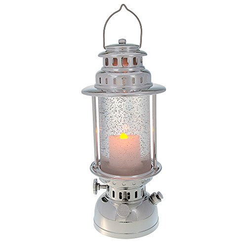 - Traditional gas lantern structure with flameless candle inside; emits a soft, glittering glow when illuminated