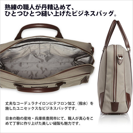 自立型B4書類対応ショルダーベルト付きです。日本のカバンの産地豊岡にて職人が真心をこめて大切に作り上げています。耐久性に優れるコーデュラナイロンを使用したカジュアルテーストの2本手ブリーフです。使い勝手もよくオールマイティにご愛用頂けます。ハンドル部分には牛革を付属し、経年変化さえも感じさせてくれます。
