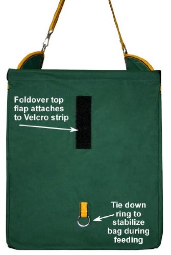 -. Feature : Large opening for easy, clean feeding (11" H x 9 1/2" W) Top load bag has large foldover flap (14" L x 13" W) / Flap fastens with Velcro closure on top, Top strap attaches with bull clip and rings / Back of bag has ring and cross-stitched reinforced loop for tying down bag / Mesh bottom retains hay, allows dirt to fall through bottom, durable and long lasting, yet light and easy to transport / Perfect for traveling or taking to shows & easy to hang and easy to load