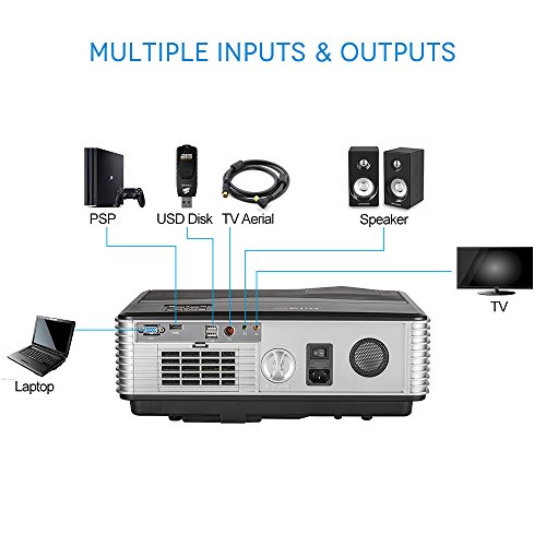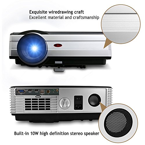 LED light source, upgraded LED lamp, 3500 lumens, 25% more Brighter than basic LED projectors in the market. Lens is rotatable to keeping image in focus. Built-in high quality stereo sound, provides real home theater experience, ideal for playing games with your family or friends.