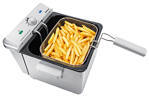 -. Feature : Edelstahlgehäuse, komplett zerlegbar / Herausnehmbarer Ölbehälter / 4 Liter Volumen / Für bis zu 1,2kg Frittiergut (optimal 0,8kg) / Profi-Heizsystem nach dem Kaltzonenprinzip / Deckel mit Kohlefilter und Sichtfenster / XL- Korb und 2 kleine Portionskörbe