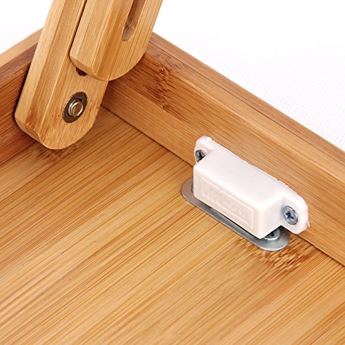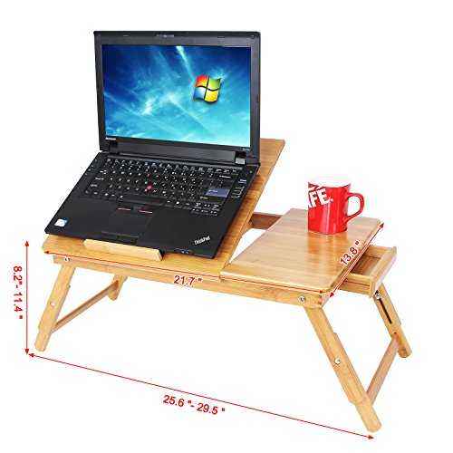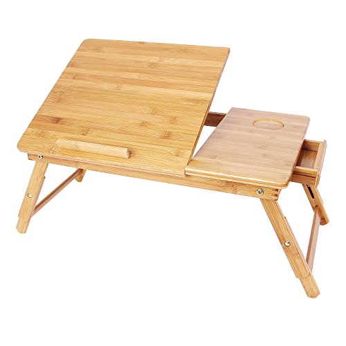-. Feature : 100% Natural Bamboo, environmental friendly, moisture resistant and easy to clean / Smooth and flat surface offers more available space to eat and write on / Adjustable tilt and legs for better viewing experience; Lightweight and foldable, easy to carry / Worry-saving Cup-Groove, small drawer for storing mouse or phone, etc / Product Dimensions: 21.7" x 13.8" x 11.4" (55 x 35 x 29cm)