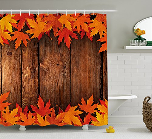 Fall Shower Curtain by Ambesonne, Dry Leaves Poured Onto Wooden Board Cabin Cottage Rustic Country Life Theme Print, Fabric Bathroom Decor Set with Hooks, 75 Inches Long, Brown Orange