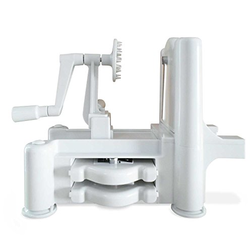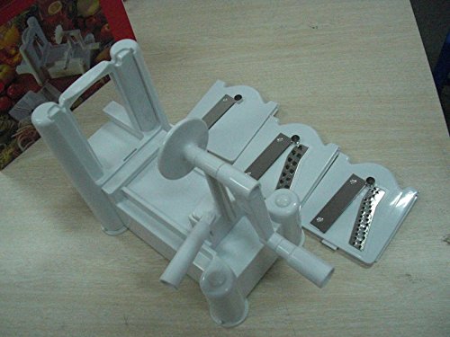 - Feature : Make fancy vegetables for fun salads and dishes with the spiral vegetable slicer / Includes 3 sets of blades: 1/8-inch spacing, 1/4-inch spacing, and straight blade for ribbon cuts / Easy to use: simply place vegetable or fruit on prongs, turn wheel while pushing base toward blade / Made of high quality, impact resistant ABS plastic; BPA free; stainless steel blades / No A/C or batteries required; backed by a 1-year warranty