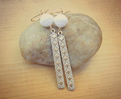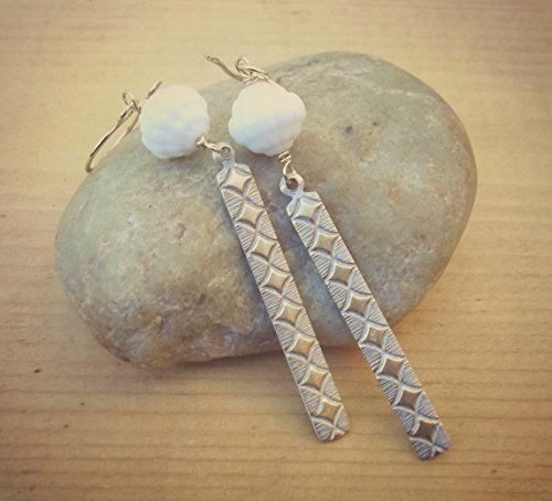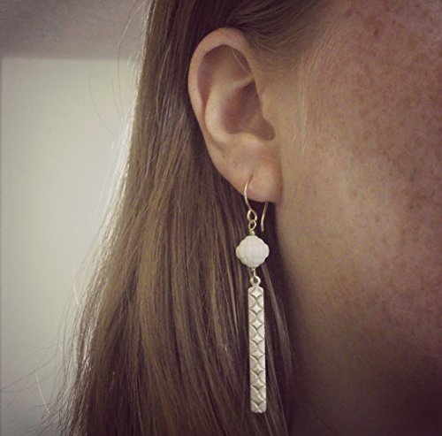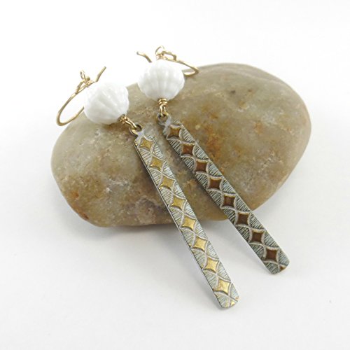 -. Title : 14K Gold Filled Earrings with White Glass Beads, and White Patina Brass Pendant Drops