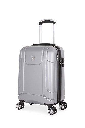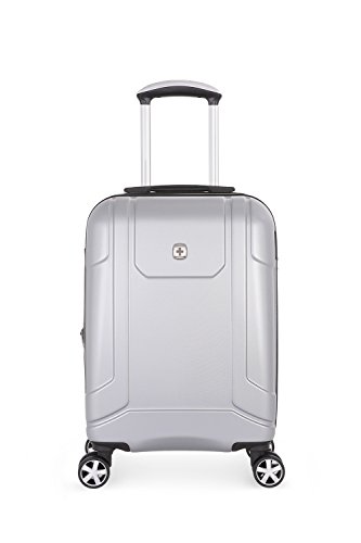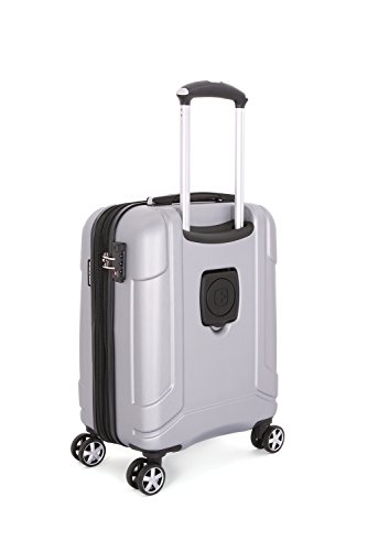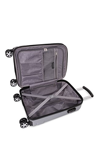 Product Description19" silver SwissGear 8 wheel spinner carry-on with retractable cup holder on back side of luggage0