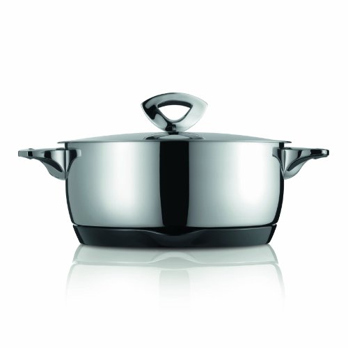 Kuhn Rikon Swiss Thermal Cookware is constructed of double-wall 18/10 Stainless Steel with an Aluminum Core. The heat efficient core distributes heat evenly, preventing sticking and burning. The convex, double-walled lid returns moisture to the center of the pan, so your food bastes as it cooks. The unique Stepped Edge feature keeps oxygen out and moisture in, so your food retains its flavor, color, and vitamins. Pan has measure lines on the inside for accurate filling. Chrome handles, edged with silicone, stay cool for safe handling. Swiss Thermal Cookware's protective clip-on magnetic heat-retaining serving base made from melamine lets you set hot pans on any surface. Food stays piping hot at the table. This popular double-walled pan is ideal for cooking soups, stews, and potatoes, as well as for poaching fish for 4 to 6 people.Feature