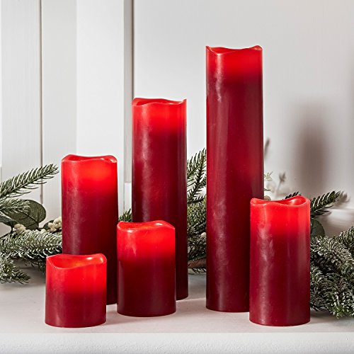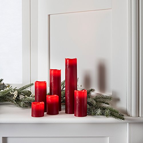 Studio : Lights4fun, Inc. Publisher : Lights4fun, Inc. Binding : Kitchen Product Description This set of 6 beautiful ruby red candles with authentic melted edges will make a stylish table centrepiece or festive display. The deep red wax is perfect paired with traditional seasonal colours such as champagne golds and forest greens. Each candle is illuminated by one warm white LED which flickers gently within and casts a cosy glow. These candles are handmade from real wax but thanks to their LED technology, they're guaranteed to stay cool so you don't have to worry about open flames or messy, dripping wax. To illuminate, simply use the super-handy remote to turn the candles on and off or to control the timer function which will cause the candles to illuminate at the same time every day for 4 or 8 hours. 0
