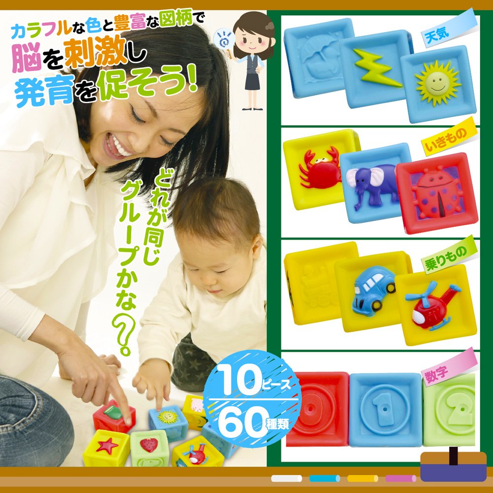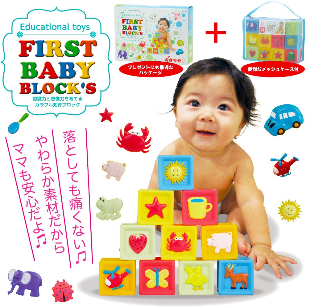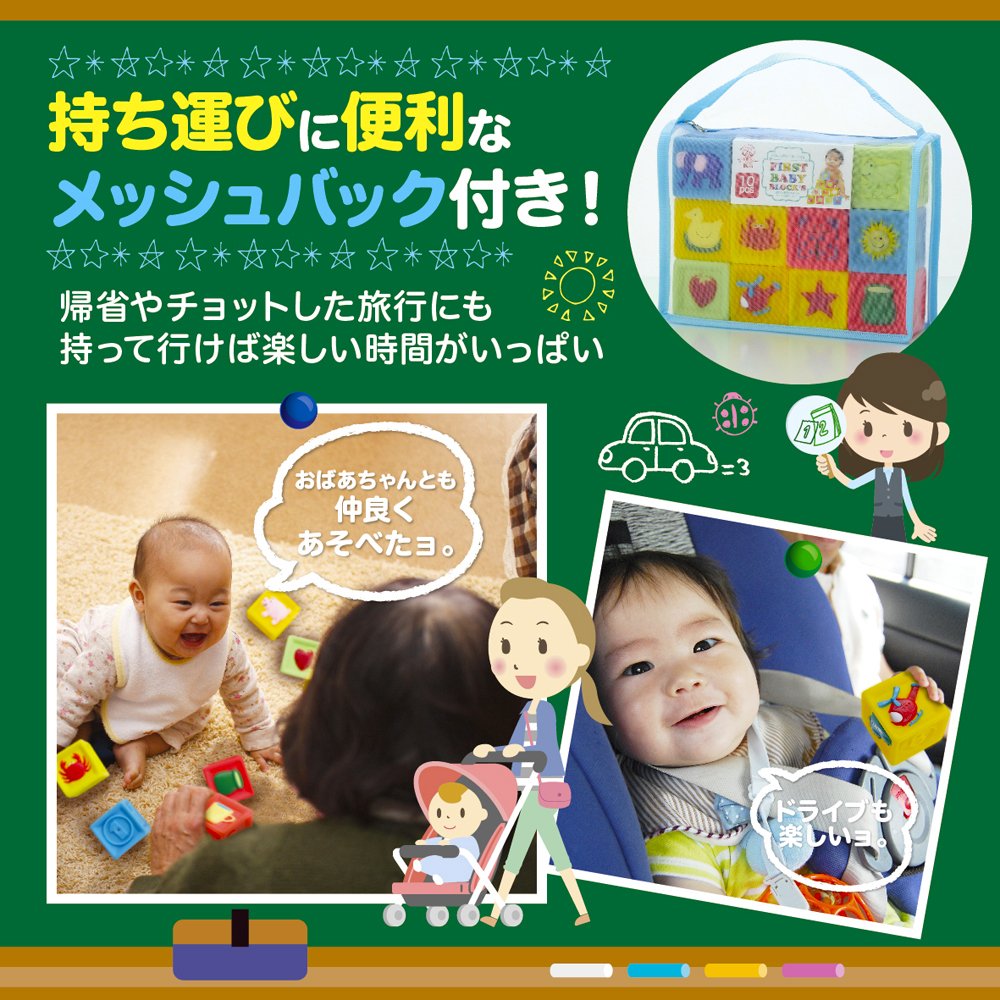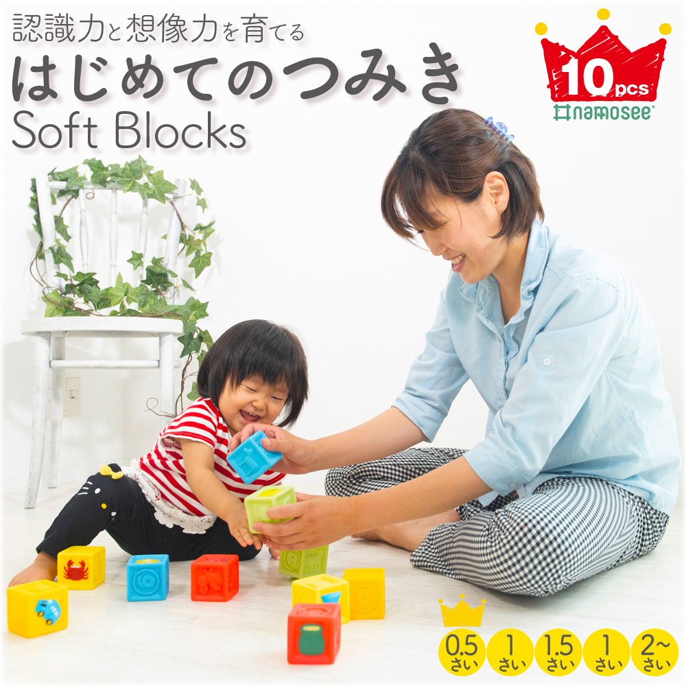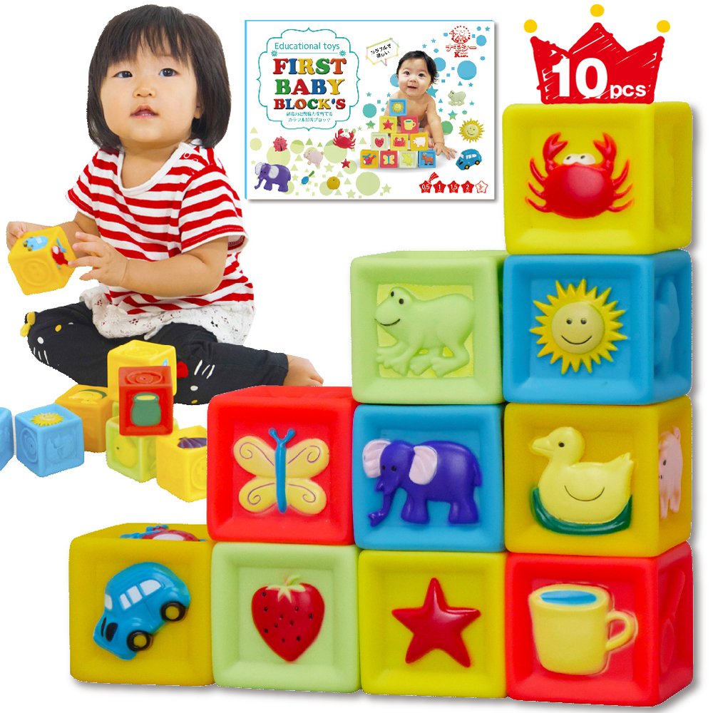 【赤ちゃんの積み木(つみき)】ぬくもりを感じる優しい手触の柔らか素材のブロック10ピースセットです。高く積んだり、積んだのを壊したり、という積み木(つみき)やブロックとしての遊びはもちろん、まだ握るのが難しい小さな赤ちゃんの手でも握りやすく作られているので、握って確かめたり、ボールのように投げたりと、ほかにも遊び方はいろいろ。カラフルで可愛いイラストと音が出る仕掛けなど、好奇心を引き出して赤ちゃんが楽しく遊ぶための工夫がいっぱい。0歳(6か月ころ)から2歳ころまで長く遊べる赤ちゃんのおもちゃです。赤ちゃんの初めての積み木(つみき)やブロックとしておすすめ。赤ちゃんが楽しく思う存分遊べます。