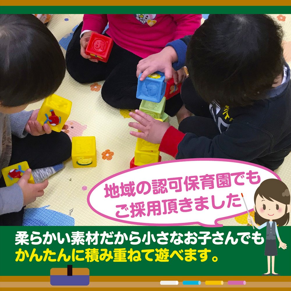 【ママも安心】大きめのキューブ型ブロックで小さなピースがないので、なんでも口に入れてしまう赤ちゃんでも誤飲の不安があまりありません。また、柔らかい素材なのでプラスチックや木製の硬い積み木やブロックと違って、落としてしまっても赤ちゃんは痛くありませんし、赤ちゃんが投げたり落としたりしてもガチャガチャうるさくありません。マンションなど音が気になる集合住宅でも音が響かないので安心です。