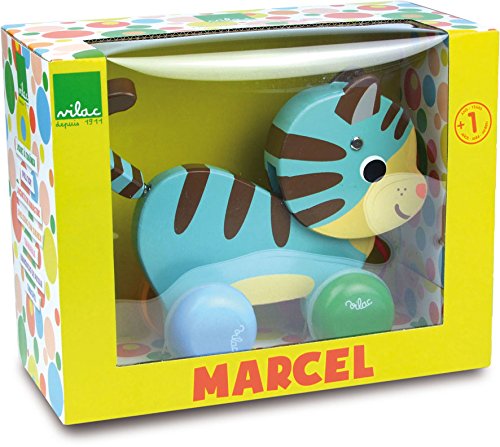 A colorful and adorable wiggly cat pull along toy. The toy has four wheels attached and the cats body wiggles as it is pulled. Made from natural wood and pulled along by a piece of red string, this toy is bright and has excellent movement, making it visually stimulating for children above the age of twelve months. This product is made by the well respected toy makers Vilac who have been making toys for over one hundred years, and display their passion and love of tradition in every item that they sell.Feature