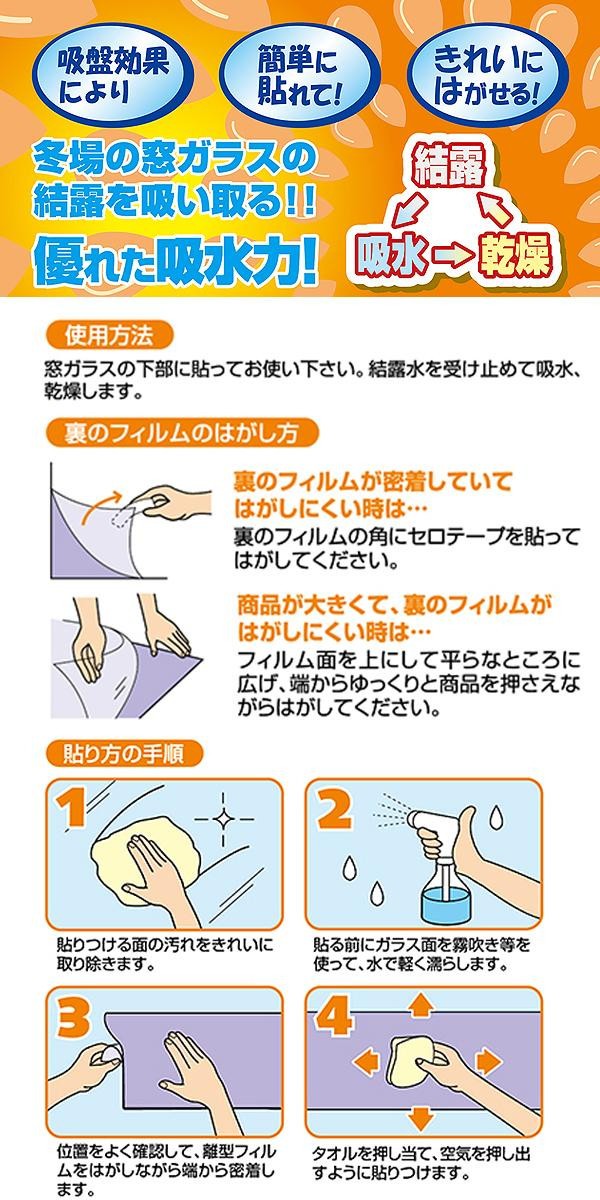 冬場の窓ガラスの結露を吸い取ります。吸盤効果により、簡単に貼れてキレイにはがせます。