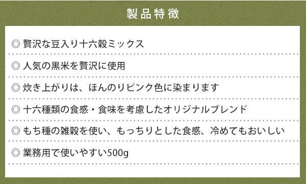 | 2種類の豆入り(黒大豆・小豆)、黒米もたっぷりブレンドされたお徳用サイズの十六穀米です。炊き上がりは綺麗な色合いに炊き上がります。雑穀ごはんとして主食はもちろん、各種メニューの素材としてもご利用いただけます。 |