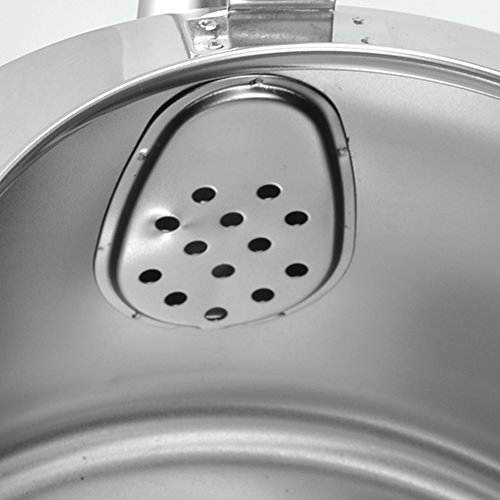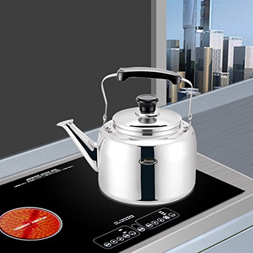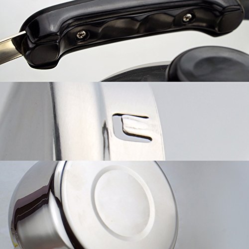 - Feature : Made of food grade 304 stainless steel, safe and durable / Safe size/capacity: 2.6 quarts (2.5 liters) / Whistle lid, heat resistant handle. Un-insulated, so it does cool down. Can not keep the water hot. / Versatile heat condition: gas stove, electric induction stove / Maximum water level hint line. Warning: Water level can not exceed the maximum water level line. If the water level is near maximum water level hint line, please pay more attention to the kettle and turn down the stove with lower power.