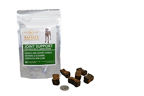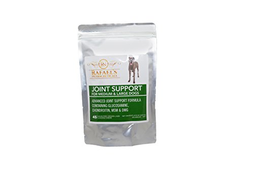 -. Binding : Misc. -. Brand : Raphael's Nutraceuticals -. EAN : 0060030010776 -. Feature : ADVANCED FORMULA: Special custom blend for maximum joint health and support. / TASTY SOFT CHEW: Which means no swallowing large capsules or hard pills. / GLUCOSAMINE: Supports joint comfort, flexibility and better mobility to stressed or injured joints. / CHONDROITIN: Supports proper structure and function of healthy connective tissues and joints. / VITAMIN C: Required for the production of collagen and glycosaminoglycans. As an antioxidant , Vitamin C also protects tissues from free radical damage. -. Label : Raphael's Nutraceuticals -. Manufacturer : Raphael's Nutraceuticals -. NumberOfItems : 0 -. PackageQuantity : 1 -. ProductGroup : Pet Products -. ProductTypeName : PET_SUPPLIES -. Publisher : Raphael's Nutraceuticals -. Size : Medium and Large Dogs -. Studio : Raphael's Nutraceuticals -. Title : Raphael's Nutraceuticals - Hip & Joint Care - Advanced Formula Joint Support For Medium and Large Dogs, 45 Chews -. UPC : 060030010776