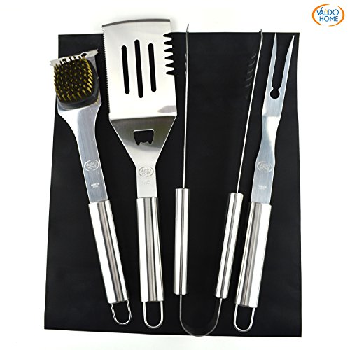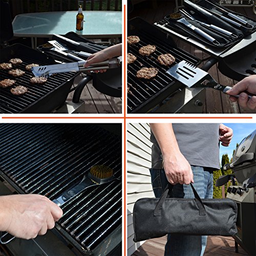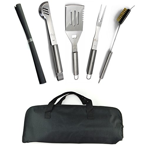 Stainless Steel BBQ Grill Tools Set - 5 Piece Grilling Tool Accessories Barbecue Kit W/ Carry Bag and Silicone BBQ Mat (5)