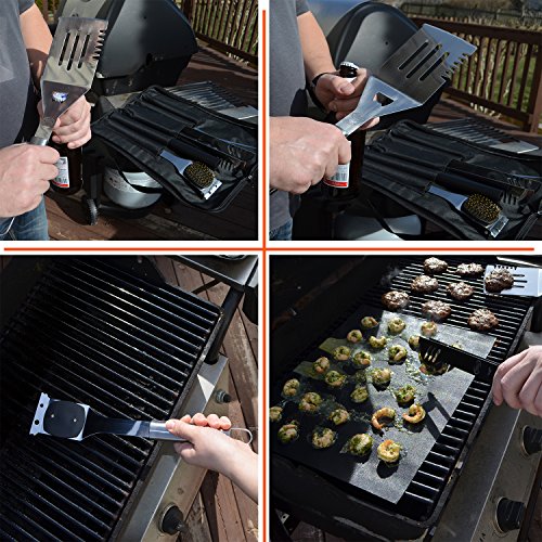 - 🔥COMPLETE KIT CONTAINS - Grill Brush, Spatula W/ Bottle Opener, Food Tongs, Meat Fork, Bbq Grill Mat And Carry Bag