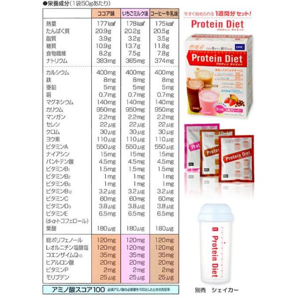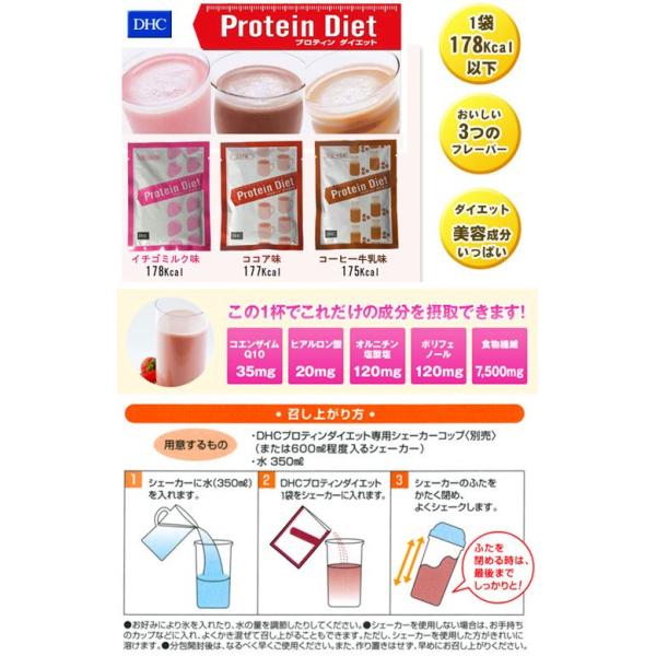 [商品名]DHC プロティンダイエット ココア味【プロティンダイエット/ココア/セット/50g/7袋】[商品説明]・普段の食事のかわりにDHCプロテインダイエット。1食分177kcaLで、1日2食のおきかえを限度にいつでもお召し上がりになれます。・1回の食事に必要な22種類のビタミン・ミネラルのほか、美容&スタイルサポート成分も充実!・ココア味には、カカオ豆100%の深い味わいが楽しめるココアパウダーとミルク、大豆のたんぱくをDHCならではのベストバランスで配合・やさしい甘みのコクとボリューム感、すっきりとした口あたりを実現しました。・合成着色料・保存料無添加[内容量]50g×7袋入り[召し上がり方](用意するもの)・DHCプロテインダイエット専用シェーカーコップ(別売)、または600mL程度入るシェーカー・水350mL(作り方)(1)シェーカーに水(350mL)を入れます。(2)DHCプロテインダイエット1袋をシェーカーに入れます。(3)シェーカーのふたをかたく閉め、よくシェークします。