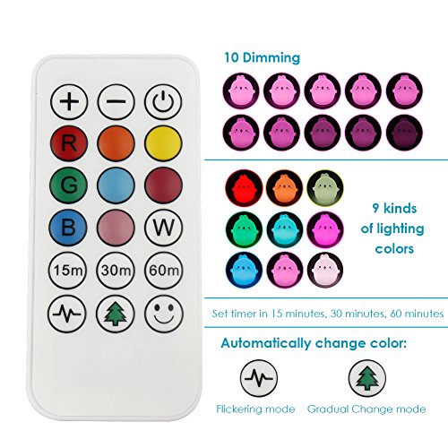 - MUITIMODES & TIME SETTING - There are 9 kinds of lighting colors and you can choose the flickering mode or gradual change mode to change color, which making it a romantic sweet nursery baby night lamp companion. There are also three-level timer you can choose: 15min, 30min and 60min.
