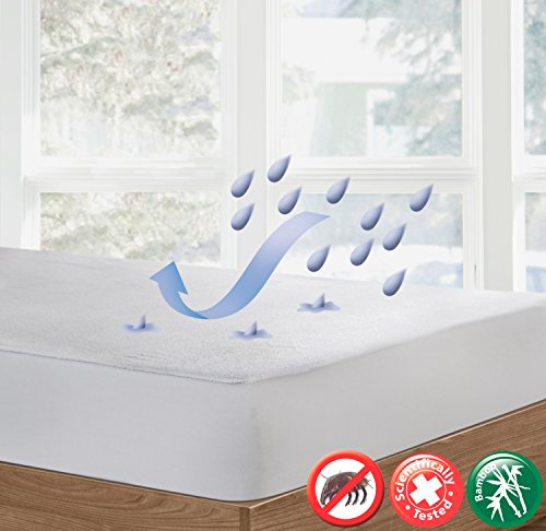 -. Feature : Mattress protector with a 100% bamboo terrycloth surface and polyurethane membrane, ultra-thin and imperceptible. Softer, fresher, smoother and more absorbent than cotton / Breathable and 100% waterproof: full protection against dust mites, allergens, bacteria, perspiration, urine and accidental spills (10-Year Warranty) / Recommended for asthma, allergy and eczema sufferers. Manufactured according to Oeko-Tex Standard 100, which ensures no harmful substances have been used. Machine wash and dry for an easy care and practical use / Doesn't change the feel of your mattress, is noiseless and highly absorbent / It fits as a fitted sheet (elastic all around) adapting to any mattress depth up to 19"