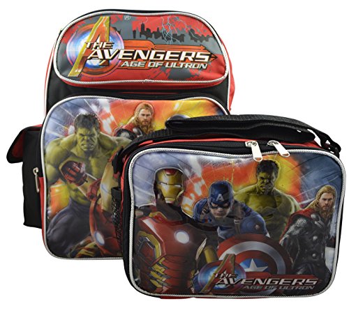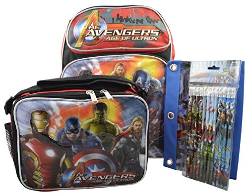 -. Brand : Marvel -. Color : Red/Black -. Department : boys -. EAN : 0708325403062 -. Feature : Brilliant colors for dazzling lunch time fun. Deluxe 3D characters finishing / Perfect for school and vacations! Well known characters that your child will love having with them. The perfect set all year round! / Backpack Features one Main Compartment, two front zippered compartments, one side mesh Pocket and one side flap pocket. Backpack Dimensions (in inches): 14 x 11 x 5 / Insulated Rectangular Lunch Kit Product Dimensions (in inches):10 x 8 x 3.5. Made of an easy to clean and very durable polyester. / Special Back to school Bonus includes: Pack of 12 Avengers Pencils and Avengers Pencil case. This Marvel Avengers Set will complete the back to school needs for the little ones! -. PackageQuantity : 4 -. ProductGroup : Apparel -. ProductTypeName : LAGE -. Size : Large -. Title : Marvel Avengers Deluxe 14" Backpack,Lunchbox w/ 3D Design Pencils and Pencil Case -. UPC : 708325403062