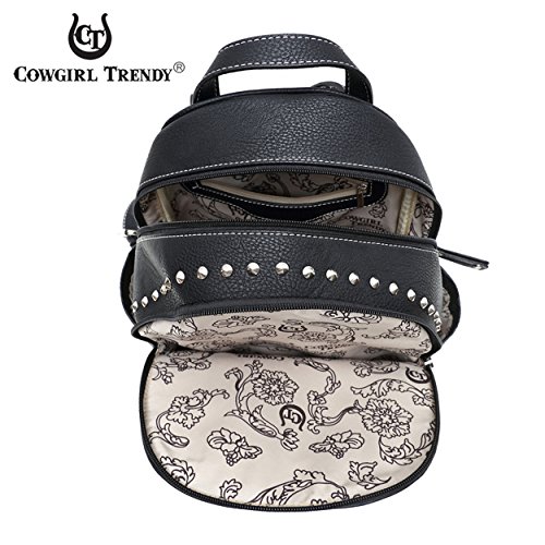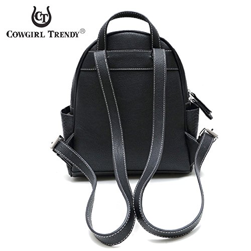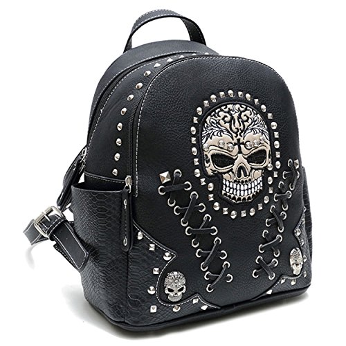 -. Brand : Cowgirl Trendy -. Color : Black -. Department : womens -. EAN : 0688970142434 -. Feature : Made from Vegan Leather - High Quality PU - with a Cotton/Polyester blend lining / Top is zippered close to keep items safely inside / Top is zippered close to keep items safely inside | Interior: 2 zipped compartments, and 1 side zipped pocket / Interior: 2 zipped compartments, and 1 side zipped pocket / Backpack: Length 11.5" Height 11.5" Width 5.5" - 14" Dual Shoulder Drops -. PackageQuantity : 1 -. ProductGroup : Shoes -. ProductTypeName : HANDBAG -. Title : Western Sugar Skull Punk Art Rivet Studded Biker Purse Women Backpack Bookbag Python Shoulder Bag Black -. UPC : 688970142434