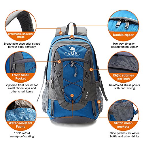 -. Brand : Camel -. Color : Royal blue -. Department : unisex -. Feature : ➤MATERIAL --- High quality thickened fabric and 150D oxford waterproof coating, with waterproof, scratch resistant, anti tear characteristics, makes the bag more durable. / ➤DIMENSIONS --- 18.5(L) x 12.2(W) x 7.9(H) inches. Weight: 1.3 pounds. The main compartment has 30L of space that can hold a size like 17 inches laptop with spare space. / ➤MULTIPLE COMPARTMENTS --- This backpack has a roomy main compartment, two front zipper pockets to hold small accessories, one internal security pockets to help you store your laptop and two side pockets for water bottles or umbrellas. / ➤ADVANTAGE --- The suture line of backpack are using eight stitches per inch, which is international standards. Shoulder straps and bag body suture are with double stitching technology to prevent the shoulder strap from forcing by heavy weight. / ➤MULTIPURPOSE --- The backpack is perfect for day-to-day use, vacation, travel, hiking, school, climbing and shopping. It is also a great gift for family and friends. -. Label : CAMEL -. Manufacturer : CAMEL -. Model : A5W3C3135BL0 -. MPN : A5W3C3135BL0 -. PartNumber : A5W3C3135BL0 -. ProductGroup : Sports -. ProductTypeName : OUTDOOR_RECREATION_PRODUCT -. Publisher : CAMEL -. Studio : CAMEL -. Title : Camel 30L Lightweight Travel Backpack Outdoor Mountaineering Hiking Daypack with Durable & Waterproof