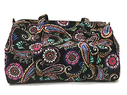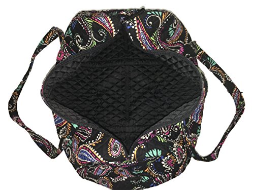 Vera's durable Small Duffel tote is made of soft quilted fabric. Vera offers the duffel in two sizes, and this is the smaller of the two. The fully zippered top closure secures a fully open interior allowing for flexibility in packing. There is an open slip pocket on the end for easy access storage. The dual straps have a comfortable drop of about 14 inches, and are sewn from the bottom, all the way up each side. Vera's Small Duffel is versatile - use it for travel (it is carryon compliant), an overnight bag, or for gym, dance or gymnastics for children or yourself. It is lightweight, and easily maintained and it can be placed in the wash. It measures 18 inches long x 8 inches high x 8 inches wide. Machine wash cold, gentle cycle, only non-chlorine bleach as needed, line dry. Patterns with solid color interiors are designed and manufactured for Vera Bradley Outlets.Feature