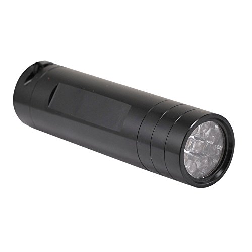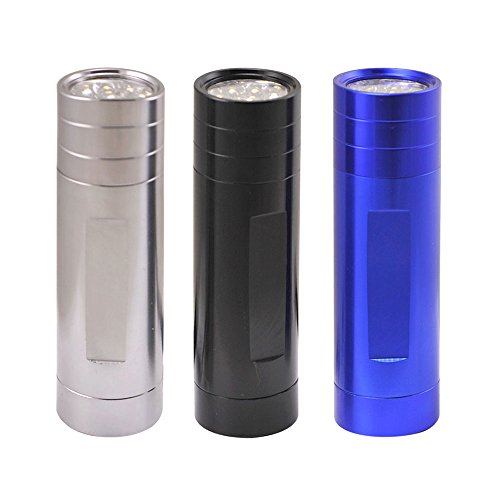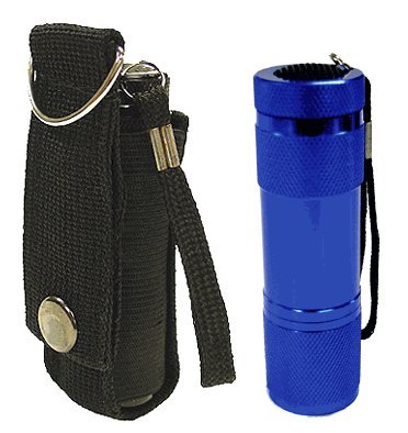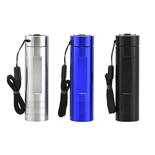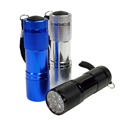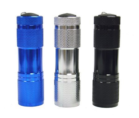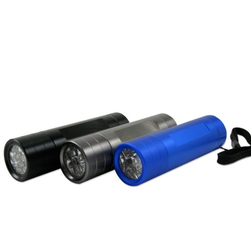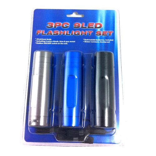 Studio : Neiko Publisher : Neiko Product Description 9 super-bright LEDs in a heavy-duty, compact flashlight. LEDs last 100,000 hours, emit pure white light--not heat--for 20 hour battery life. Perfect for glove-box, tool-box, purse or desk drawer. Uses 3-AAA batteries (INCLUDED). Unique positive-action weather-proof switch prevents accidental battery drain. Anodized aluminum barrel, water-resistant and shock-proof. 3-pack combo set, comes with Blue, Jet Black, Gunmetal color. This amazing compact flashlight is like a spotlight you can carry in your pocket or purse! NINE light-emitting-diode (LED) bulbs produce a flood of pure, white brilliance but because LED bulbs produce very little heat, three inexpensive AAA batteries will last for over 20 hours continuous. Positive-action switch (click on/click off) won't go on accidentally in car, toolbox or pocket. Heavy-weight anodized aluminum barrel is corrosion- and water-resistant.