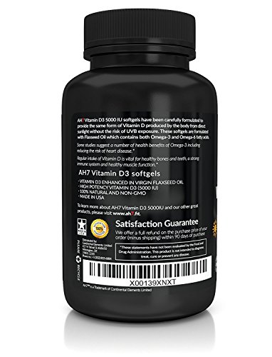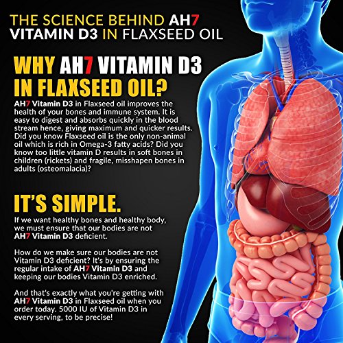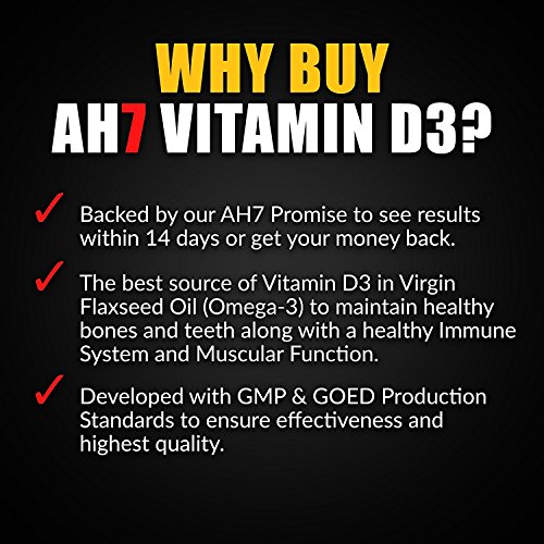 ✔ THE DEFINITIVE VITAMIN D3 WITH A 110% MONEY BACK GUARANTEE - There is no match for world-class AH7 Vitamin D3. With 5000IU of vitamin D3 mixed with premium quality Virgin Flaxseed Oil, it is one of the most potent Vitamin D3 available in the market. Developed in FDA approved facility, it is the undisputed leader for ensuring your body is able to take highest quality Vitamin D3. Plus the results are guaranteed with our AH7 promise - see results of 110% of your money back. Simple!