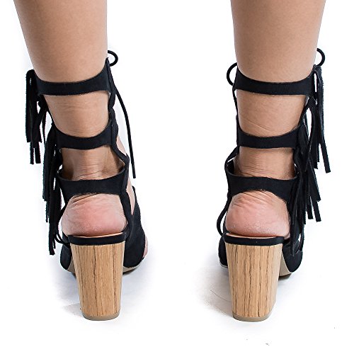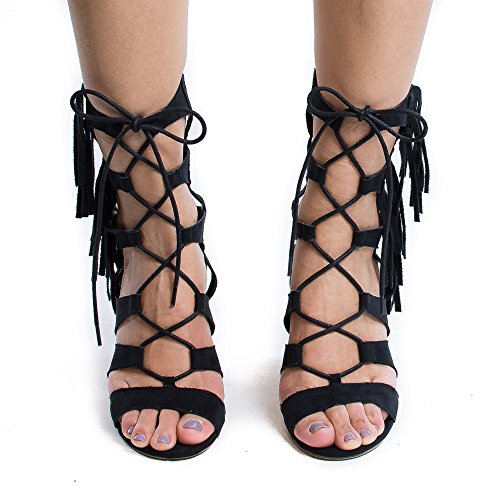 Binding : Apparel Product Description Make heads turn with these Roman gladiator inspired heeled sandals, featuring an open toe, contrast stitching, adjustable laces, fringe on the sides, a slightly padded insole for comfort, and an approximate 3.5 inch high block heel. (Please note that these measurements are based on a size 7). Available Black, Taupe, etc. All man made materials. By Aquapillar. 0