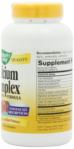 -. Binding : Health and Beauty -. Brand : Nature's Way -. Department : Health and Beauty>Health and Wellness -. EAN : 0033674412114 -. Feature : Nature's Way -. IsAdultProduct : 0 -. IsAutographed : 0 -. IsMemorabilia : 0 -. Label : Nature's Way -. LegalDisclaimer : * These statements have not been evaluated by the Food and Drug Administration. This product is not intended to diagnose, treat, cure or prevent any disease. ** Always refer to the manufacturer's label on the product for description, recommended dose and precautions. -. Manufacturer : Nature's Way -. Model : 41211 -. MPN : 41211 -. NumberOfItems : 1 -. PackageQuantity : 1 -. PartNumber : 41211 -. ProductGroup : Health and Beauty -. ProductTypeName : HEALTH_PERSONAL_CARE -. Publisher : Nature's Way -. ReleaseDate : 2010-05-13 -. Size : 250 -. Studio : Nature's Way -. Title : Nature's Way Calcium Complex Bone Formula, 250 Capsules -. UPC : 033674412114