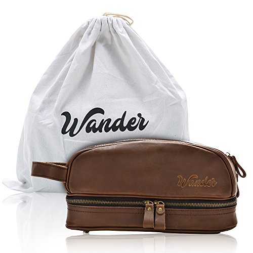 -. Feature : CLASSIC, RUSTIC LEATHER-BOUND Real full grain handmade genuine leather dopp kit; NOT faux or PU leather, plastic or canvas. This Brown or Black toiletry bag is 100% real leather with a distressed vintage look that burnishes and beauties with use. / BEST QUALITY MATERIALS High end YKK zippers are opposing to keep stuff from falling out of your toiletry kit. The waterproof inner lining keeps residual wetness from shower shampoo conditioner bottles from leaking into your dry travel bag. / PERFECTLY SIZED & PORTABLE lightweight case for international travel, fits in duffels, garment travel bags, backpacks, camping or gym bags; makes a great shaving bag, toiletry kit, ditty bag, travel kit, cosmetic toiletry bag, or travel dopp kit / SO MANY USES don't let its cute size fool you; carry many makeup or shave accessories; for man or woman, boys, girls, kids, adults; this hanging toiletry kit and travel organizer fits in small bag, large suit bag, or in airline carry on or checked baggage / GET ORGANIZED IN STYLE with a compact leather toiletry bag from the travelers at Wander; whether taking to the air, camp trailer, baby and family in a hotel overnight, or simply for a first aid or grooming hygiene personal dittie. Free laundry bag.