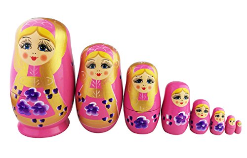 -. Feature : 7.1" Handmade wooden nesting doll / Consist of 8 dolls in a set, stacked into the biggest one to stand as a whole / Oily shiny and bright colored surface painting, featuring blonde girl and purple flowers against pink background / Multi- functional, not only as toy that entertains kids, but also inspires their exploration on unknowns / Smart gift pick for people who has the appreciation of nesting dolls, or wants for decoration piece