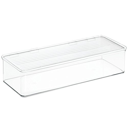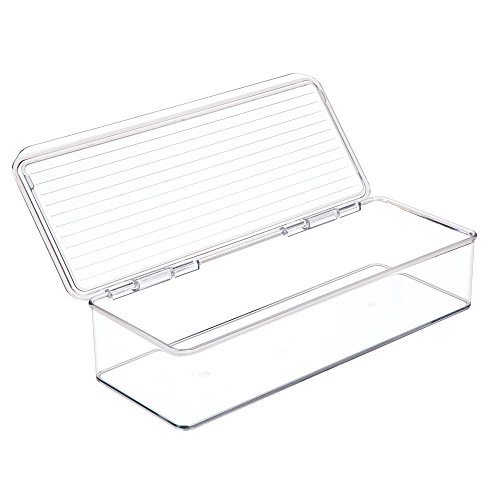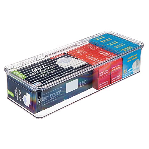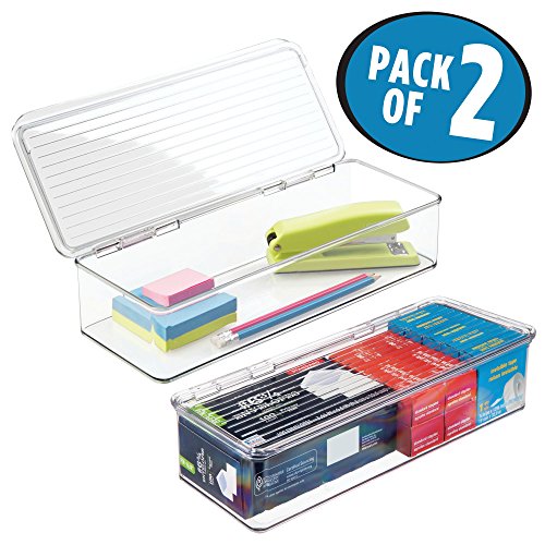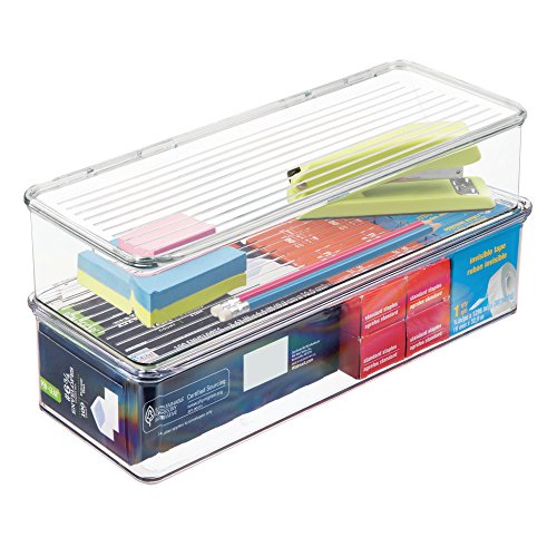 mDesign Stackable Office Organizer Bins with Hinged Lid, 5.5" x 13.3" x 3" - Pack of 2, Clear