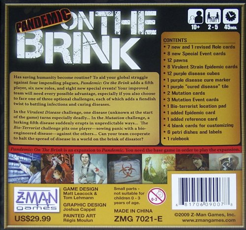 -. Author : Matt Leacock -. Binding : Toy -. Brand : Z-Man Games -. EAN : 9781706090076 -. Feature : 2 to 5 players / 45 minutes / Pandemic On the Brink is an expansion to our popular cooperative game. Pandemic, wherein players take on roles to work together to fnd cures to 4 diseases. / Virulent Strain challenge: makes one disease become particularly deadly in unpredictable ways / Mutation Challenge: adds a fifth (purple) disease that behaves differently than the original four -. Genre : Strategy -. IsAdultProduct : 0 -. ISBN : 1706090072 -. ItemPartNumber : ZMG7021E -. Model : 7021EZMG -. MPN : ZMG 7021-E -. PackageQuantity : 1 -. PartNumber : ZMG 7021-E -. ProductGroup : Toy -. ProductTypeName : TOYS_AND_GAMES -. PublicationDate : 2010 -. Title : Pandemic On The Brink -. UPC : 681706170213 -. Warranty : No Warranty