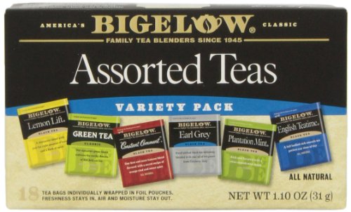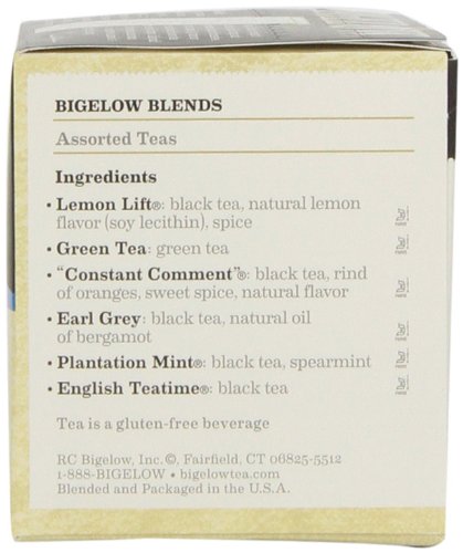 -. Binding : Grocery -. Brand : Bigelow Tea -. EAN : 0072310001923 -. Feature : Pack of six 18-count boxes of calorie-free tea in six assorted flavors (108 total tea bags) / Assortment of Lemon Lift, Green Tea, Constant Comment, Earl Grey, Plantation Mint, and English Teatime teas / Gluten free, with no calories and no carbohydrates; Kosher Parve / An excellent source of healthy antioxidants / Ships in Certified Frustration-Free Packaging -. Label : Bigelow -. LegalDisclaimer : Actual product packaging and materials may contain more and different information than what is shown on our website. We recommend that you do not rely solely on the information presented and that you always read labels, warnings, and directions before using or consuming a product. -. Manufacturer : Bigelow -. Model : 7231000192 -. MPN : 529071-00192 -. NumberOfItems : 6 -. PackageQuantity : 6 -. PartNumber : 529071-00192 -. ProductGroup : Grocery -. ProductTypeName : GROCERY -. PublicationDate : 2010-10-13 -. Publisher : Bigelow -. ReleaseDate : 2006-06-22 -. Size : 6 Pack -. Studio : Bigelow -. Title : Bigelow 6 Assorted Teas, 18-Count Boxes (Pack of 6) -. UPC : 072310001923