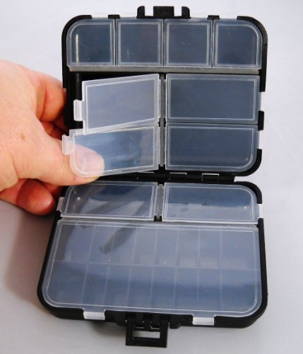 -. Feature : 11 Individual Compartments safely holds your flies / Each Compartment has it's own snap-tight lid / Tough Polypropylene with stainless steel hinge pin / This sale is for 2 boxes- each with 11 compartments / Large compartment is segmented for holding dozens of flies
