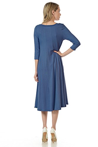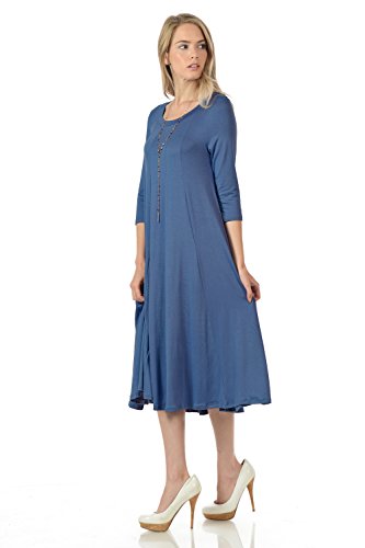 A-line trapeze midi dress features a scoop neckline and 3/4 length sleeves. This dress is made with knit jersey that is soft, drapes well and has great stretch. Accessory not included.