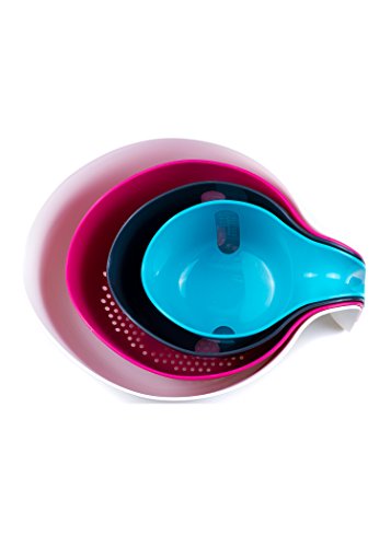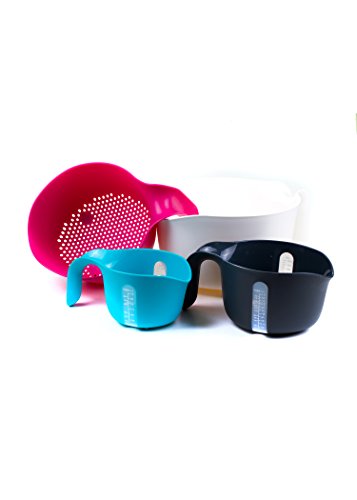 - MULTIPURPOSE SET - everything you need for a mixing bowl is here: large mixing bowl (3 quart), colander (2 quart), 2 measuring cups (1 and ½ quarts) are ideal for buttering sheet cakes, pie filling, stirring dressings, beating eggs, tossing salads, kneading dough as well as any other cooking or baking purposes.
