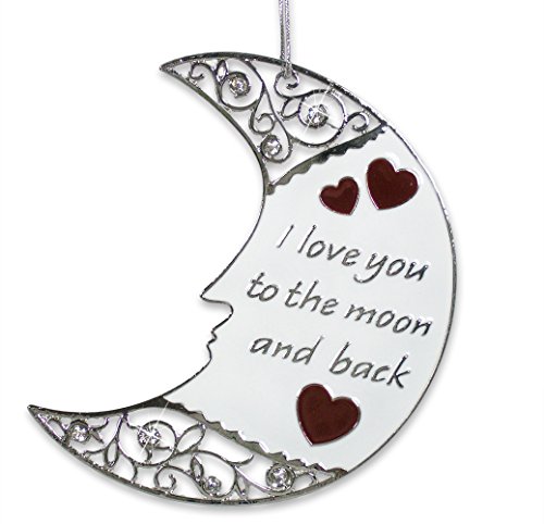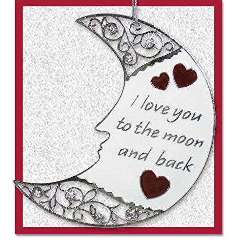 I LOVE YOU TO THE MOON AND BACK brilliantly embossed on a hanging moon ornament with hearts. Attractive and uniquely designed