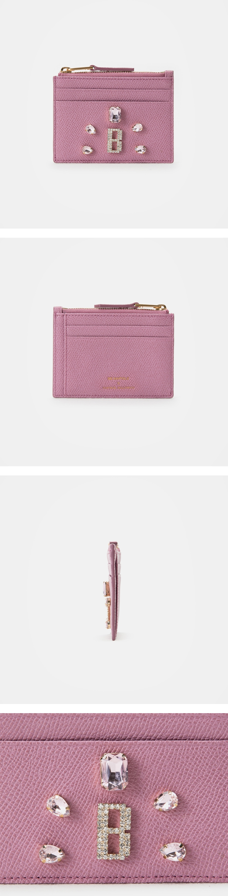 빈폴액세서리의 빈티지 헐리우드 콜라보 카드지갑입니다.국내 1세대 커스텀 쥬얼리 브랜드 빈티지 헐리우드와의 콜라보 라인으로 기존에 시도하지 않았던 장식을 활용한 카드지갑입니다.페미닌하며 블링블링한 무드로 구성된 아이템입니다.리프레시 할 수 있도록 제안하는 포인트 제품입니다.사이즈: 10.6*7.5cm(42.5g).제품설명 - 카드칸 4 / 오픈칸 1 / 지퍼칸 1.