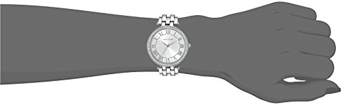 Slightly domed mineral crystal lens; bezel set with 60 clear Swarovski crystals; silver-tone sunray dial with matching hands and roman numerals; black printed minute track