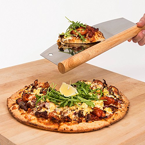 Our pizza cutters have an extra sharp, extra large 14-inch high grade stainless steel blade that lets you slice across piza with one rocking motion. Unlike commerical wheel cutters you don't have to worry about toppings getting stuck to your pizza blade when slicing with our blades.