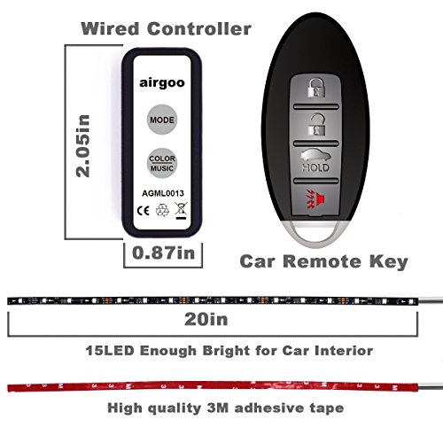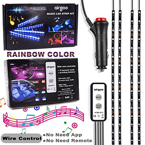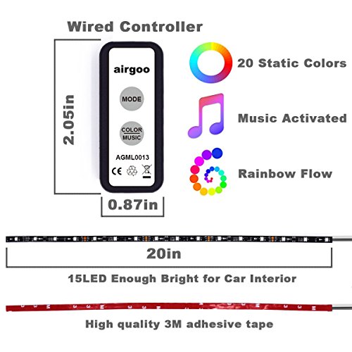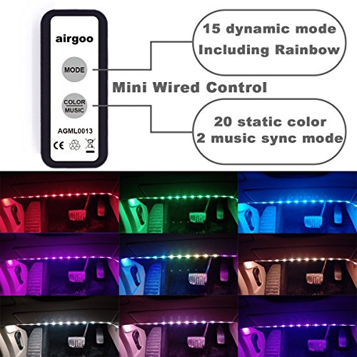 Studio : airgoo Publisher : airgoo Product Description Package Included 1 * Mini Wired Controller 1 * Cigarette Lighter Adapter 4 * 20 inches RGB LED Strip Light 1 * User Manual Installation 1.Make sure that you have all the parts mentioned in the package list. 2.Plug the Cigarette Lighter Adapter and make sure the indicator light is on. 3.Peel off the red paper and stick the adhesive tape in a proper position under the seats. 4.Connect the controller with the cigarette lighter adapter. Functions 15 dynamic modes 20 static colors 2 music sync modes Warning 1.These lights working voltage is 12V, can't be powered with high voltage. 2.These lights are just for car interior using, can't be used for any other places. 0
