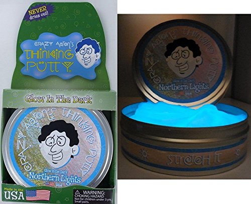 Studio : Crazy Aaron's Thinking Putty Publisher : Crazy Aaron's Thinking Putty Binding : Toy Product Description Collect them all! Crazy Aaron's Thinking Putty Crazy Aaron's Thinking Putty is unique, collectible and FUN! Brand new and in the original box, each Thinking Putty comes in it's own matching collectible tin. Your home or office becomes an experimental laboratory when you have your Thinking Putty with you. You can use Thinking Putty as a toy, a stress ball, a squeeze toy, or as therapy putty. Knead it, snap it, bounce it, pop it, stretch it... it won't dry out! Features of Crazy Aaron's Thinking Putty Knead it, snap it, bounce it, pop it, stretch it! Will not dry out Comes in matching collectible full size 4" tin 1/5 pound of putty (3.2 ounces) Brand new factory fresh Proudly made in the USA Thinking Putty is inert, non-toxic and safe; contains no latex, gluten, wheat compounds, or phthalates Compliant with ASTM F963 and EU standards EN 71 Parts 1, 2 3 Ages 3 (Except Phantoms Magnetics are 8 ) Glow in the Darks are hypnotic and irresistible! Milky white in daylight, their glow magically appears when the lights dim. You can use a blacklight keychain to write messages on the putty and draw special designs. After exposure to light (the brighter, the better), these colors will glow for hours. Northern Lights Shimmery white leads to rivers of iridescent purple, pink, and turquoise in Northern Lights Thinking Putty. 0